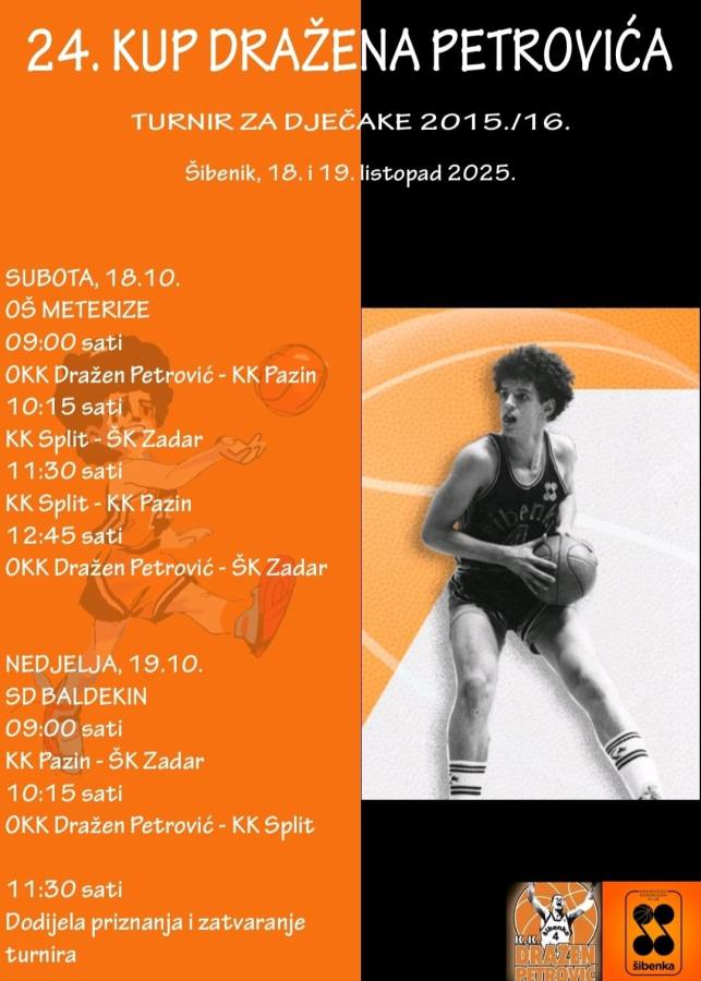 U povodu obilježavanja 61. rođendana Dražena Petrovića, jednog od najvećih hrvatskih i svjetskih košarkaša svih vremena, OKK Dražen Petrović organizira 24. Kup Dražena Petrovića, turnir za dječake rođene 2015./2016. godine. Košarkaški turnir održat će se u Šibeniku u subotu i nedjelju, 18. i 19. listopada 2025. godine.